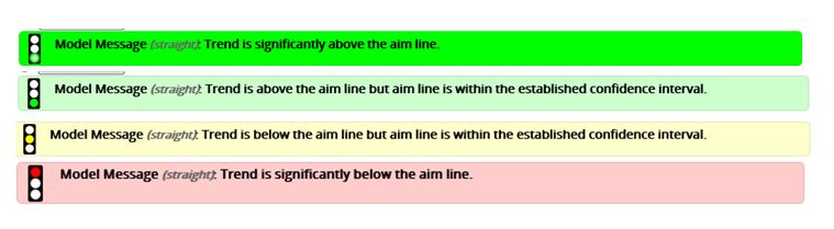 The model message reports the status of an intervention plan. The model message reports the status of an intervention plan. The status of the intervention plan is rated along a continuum of significantly above expectations to significantly below. The familiar stoplight analogy is used to make interpretation more automatic.