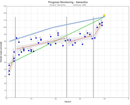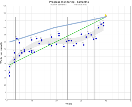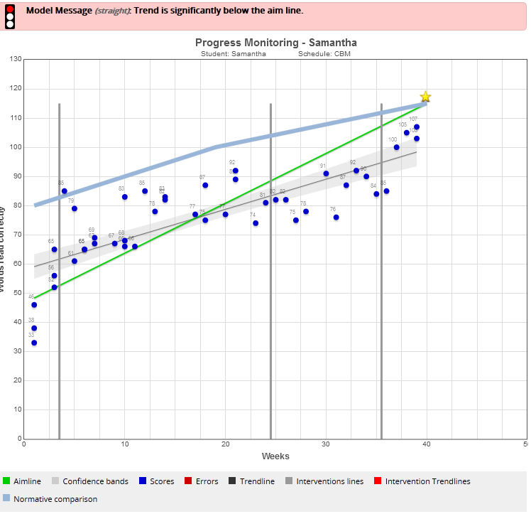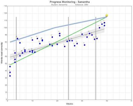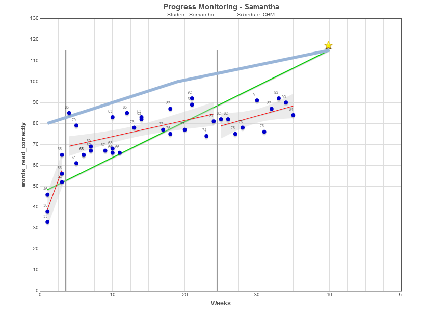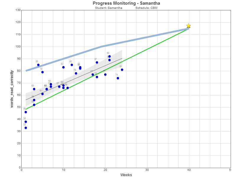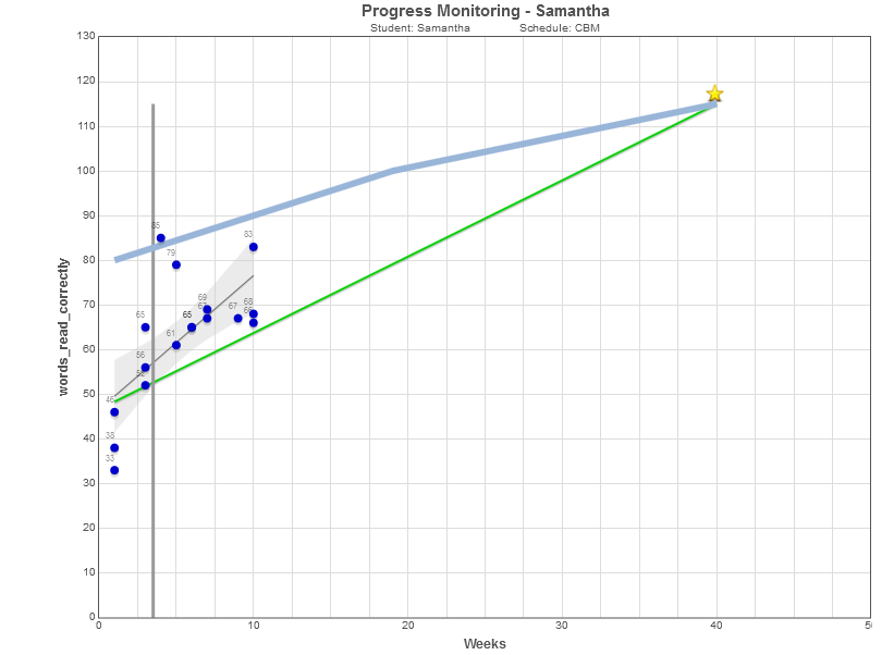 The plan for Samantha was put into place. Samantha would work with a small group for 30 minutes a day, using the Corrective Reading Decoding B1 series from SRA McGraw Hill. within a few weeks, Samantha's family brought in an advocate to argue that Samantha required special education services. The advocate argued that a different instructional program was preferable, and that Corrective Reading was not being implemented with fidelity, as the program requires 45 minutes. The graph in Figure 2 was presented to the parents and the advocate. During the discussion the parents began to question the ups and downs seen in the data, the concept for Edutools.us was born. What the parents were asking for was a confidence interval. Working with the data, in a variety of programs a graph similar to the one presented in Figure 3 was created. In figure 3, the data are presented with the raw data (blue dots), the aimline (green line ending at a star), the normative comparison (blue line), a trend line (grey line) and a 95 percent confidence band (grey filled section). When this graph was presented to the advocate, he reported to the parents that Samantha was in good hands, Although Samantha was still significantly behind her peers, the data showed that she was making strong progress, the concerns about the program were not warranted.