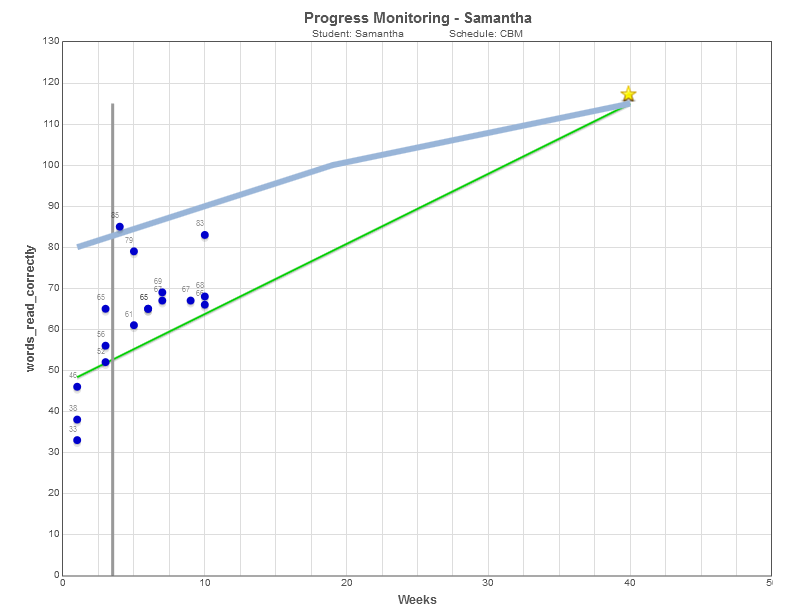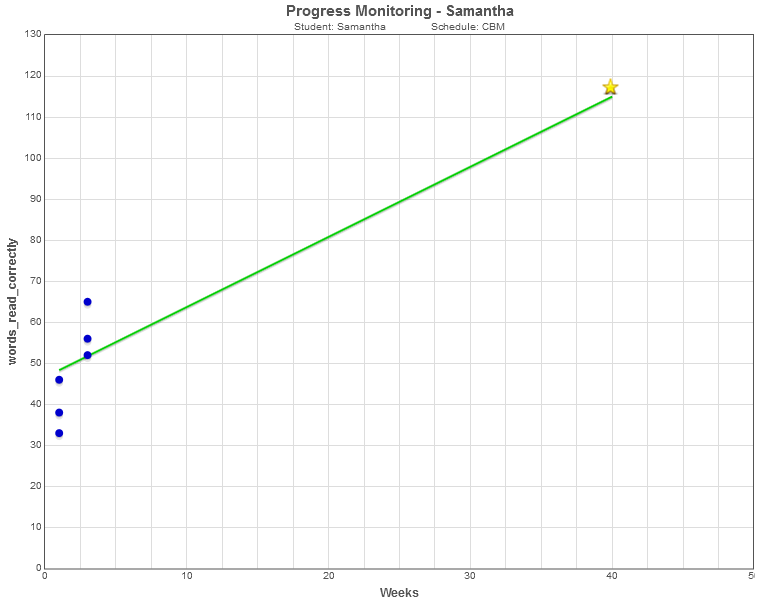 Samantha, female, at risk, grade 3. During Universal screening Samantha was identified as performing significantly below expectations. In order to demonstrate the consistency of the baseline data, all three initial data points are displayed on the graph. Samantha's case was already on the docket for problem-solving, though previous scores did not indicate the degree of discrepancy seen with universal screening. When the team reviewed Samantha's data it was determined that three additional data points should be collected. After collection of three additional points, data were graphed, and the plan for Samantha was put into place, including a challenging but attainable goal of 115 correct words per minute by the third benchmarking period. Specifically the goal for Samantha was written as In 40 weeks, g